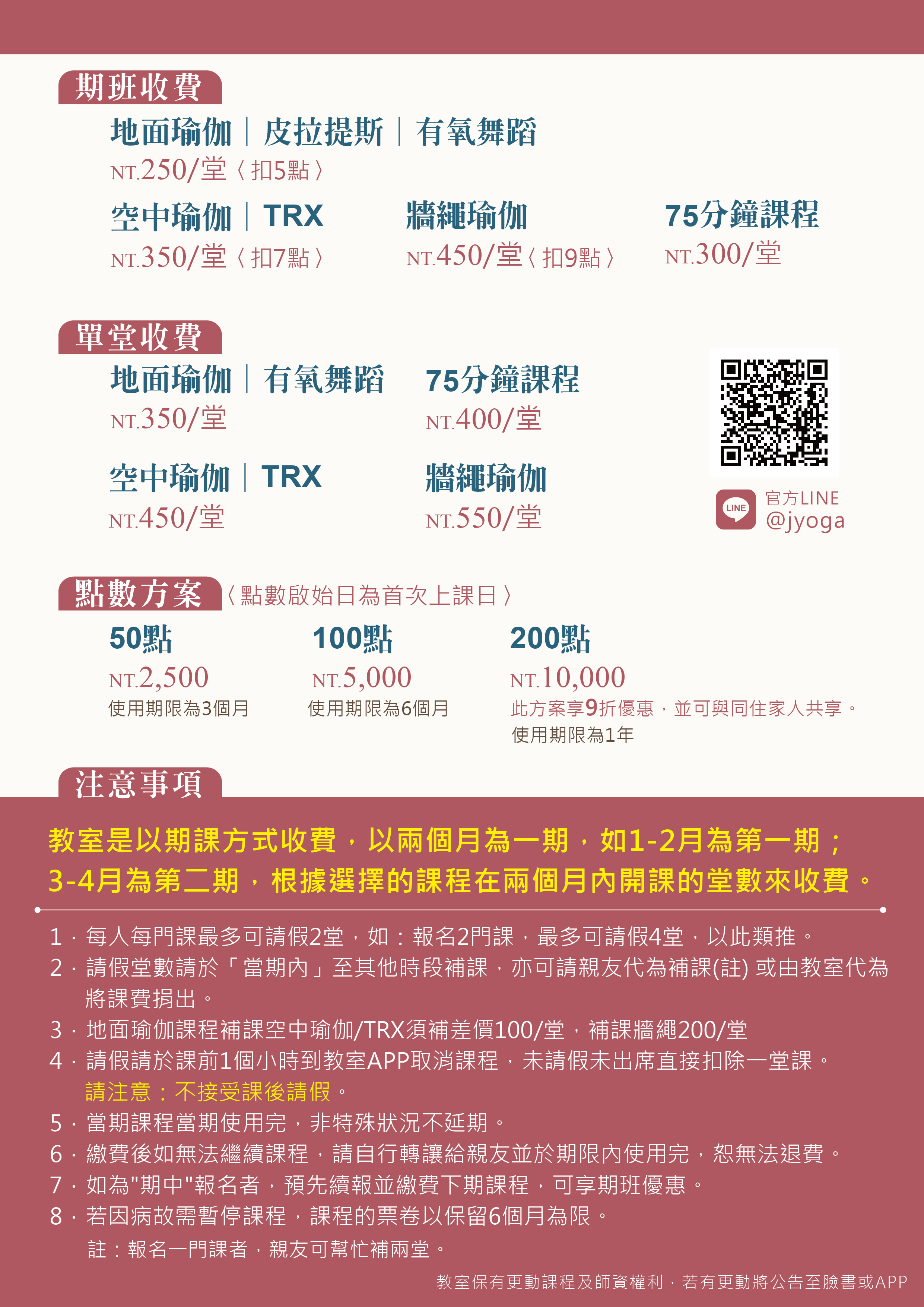 請提早五分鐘前進入到教室,將手機切到靜音模式,保持一顆平靜開放的心,穿上合身的運動服或瑜伽服,並且帶上你的水壺、毛巾以及止滑的瑜伽墊就可以來進行練習,當然你也可以佩戴平常運動所需要的配件。 TRX 課程可能會需要你穿上球鞋,請事先與我們確認。