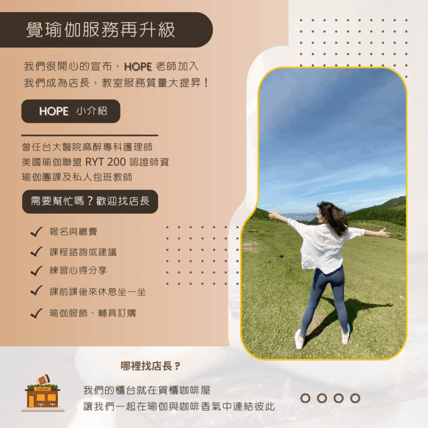 如果你無法完成某些動作,請不要覺得難過或驚慌,因為從小到大我們身體的使用,造成了身體無法完成某些動作,只要持續的穩定練習並了解成因,將可以克服這些問題。另外,請專注你的呼吸,並在你覺得不適時停下動作,這樣有助你的瑜伽練習是安全且不會持續造成傷害的。如果你是容易緊張的人或是不習慣身後有人,請鼓起勇氣和同學協調交換一下舒適的位置。